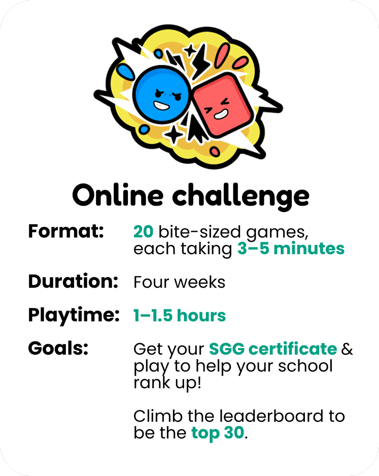 Each online challenge consists of 20 bite-sized games (3–5 minutes each) that students can play individually or with friends. Schools and students earn points to climb the leaderboard, earn certificates, and qualify for rewards.​